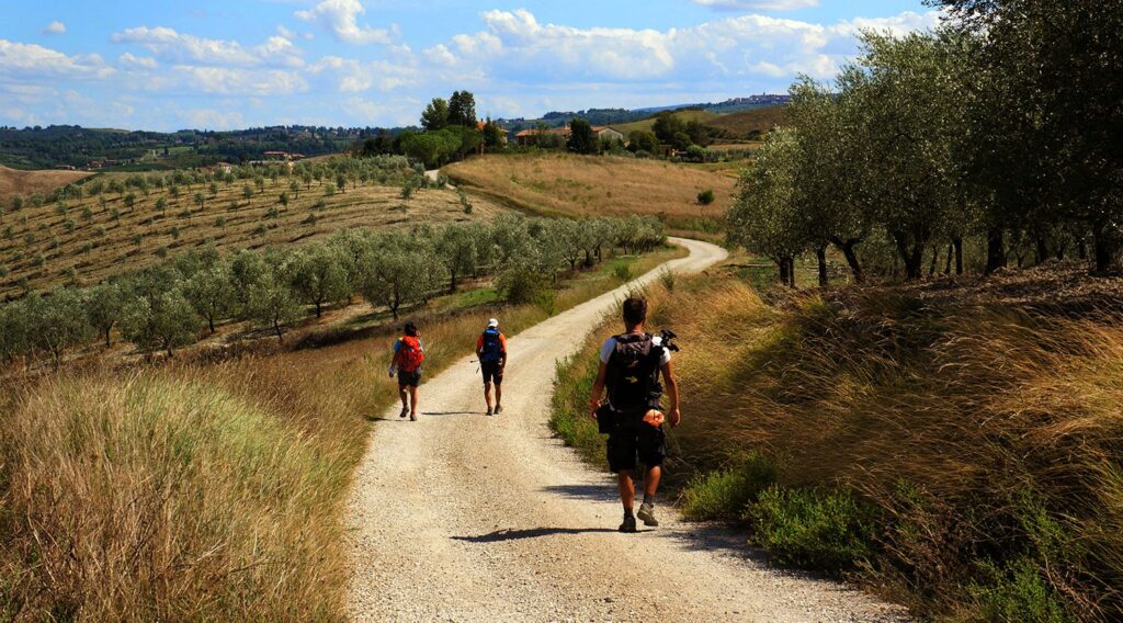 Il percorso: Si parte da San Quirico d’Orcia, borgo medievale con i suoi giardini all’italiana e la collegiata. Si cammina lungo una strada bianca che si inoltra nella campagna, regalando scorci da cartolina sui famosi cipressi di San Quirico (quelli che tutti abbiamo visto almeno in una foto). La meta è Bagno Vignoni, unico nel suo genere: qui l’acqua termale scorre non in vasche ma in una grande vasca rettangolare al centro della piazza del borgo. In marzo, il vapore che si alza dall’acqua calda crea un’atmosfera quasi magica.